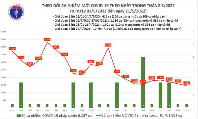 Về tình hình dịch Covid-19 hôm nay, Bộ Y tế cho biết từ 16 giờ ngày 20-5 đến 16 giờ ngày 21-5, trên Hệ thống Quốc gia quản lý ca bệnh Covid-19 ghi nhận 1.457 ca nhiễm trong nước (giảm 130 ca so với ngày trước đó) tại 43 tỉnh, thành phố (có 1.218 ca trong cộng đồng).