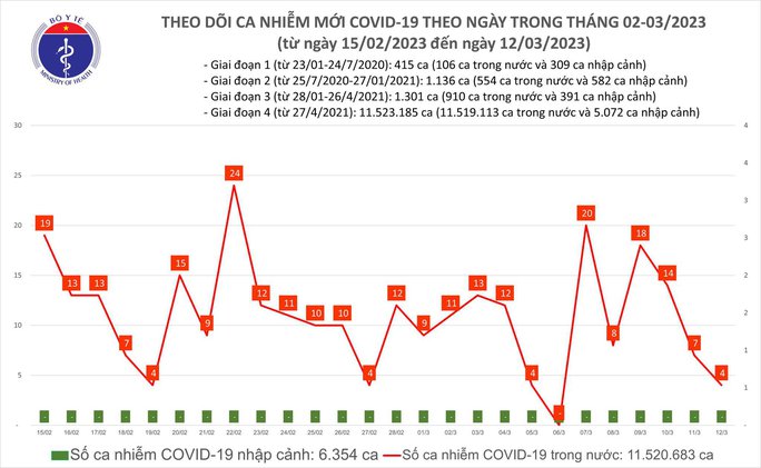 Về tình hình dịch COVID-19 hôm nay, Bộ Y tế cho biết từ 16 giờ ngày 11-3 đến 16 giờ ngày 12-3, cả nước ghi nhận 4 ca mắc, giảm sâu so với ngày trước đó. Theo thống kê trong 7 ngày qua, Việt Nam chỉ ghi nhận hơn 74 ca COVID-19 mới. So với tuần trước đó, số ca mắc mới tuần này tương đương.
