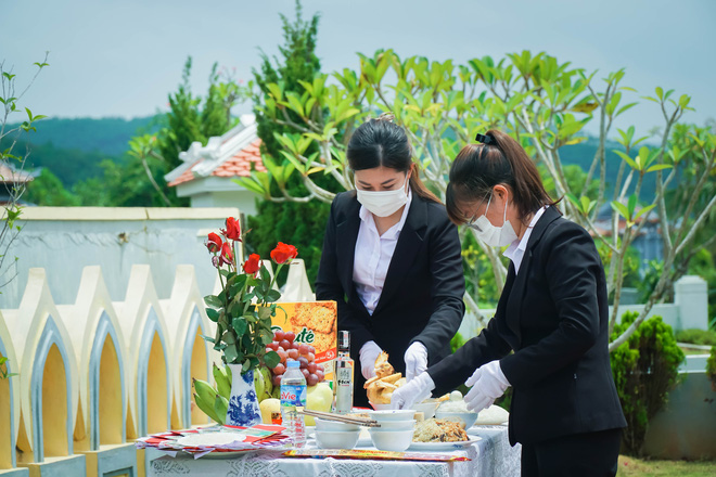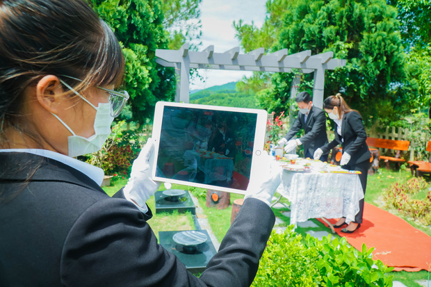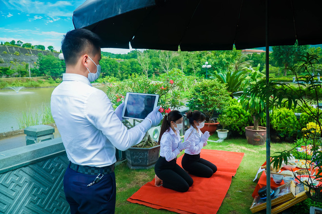 Trong khi chị Hồng dâng mâm cỗ, sắp hoa quả, thắp hương, thì một nam nhân viên khác, trong bộ vest đen lịch sự, dùng thiết bị điện tử, quay lại hình ảnh hoặc video call với khách hàng.