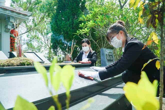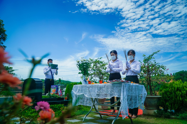 Tận mắt chứng kiến nhân viên nghĩa trang dọn dẹp mộ, lau chùi, sắp lễ, cúng bái thay gia đình, cô Hồng cũng yên lòng. Gia đình nghẹn ngào vái vọng từ xa, nhắn nhủ đôi điều trong tâm khảm với người quá cố.