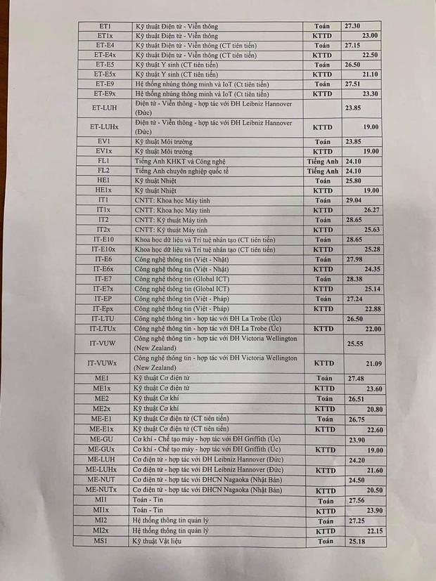 Cụ thể, điểm chuẩn đại học Bách khoa Hà Nội năm 2020 như sau: