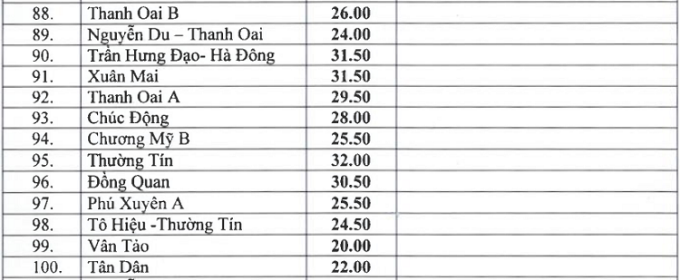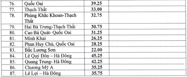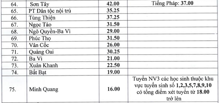Tổng chỉ tiêu vào các trường công lập và công lập tự chủ năm nay là 67.230, trường ngoài công lập là 21.820. Số còn lại phải học trung tâm giáo dục nghề nghiệp - giáo dục thường xuyên, học nghề. Tính theo nguyện vọng 1, trường THPT Chu Văn An đứng đầu về tỷ lệ chọi (1/2,4). Các trường theo sát gồm THPT Sơn Tây (1/2,3), Trung Văn (1/2,2), Yên Hòa (1/2,2), Nhân Chính (1/2,1).