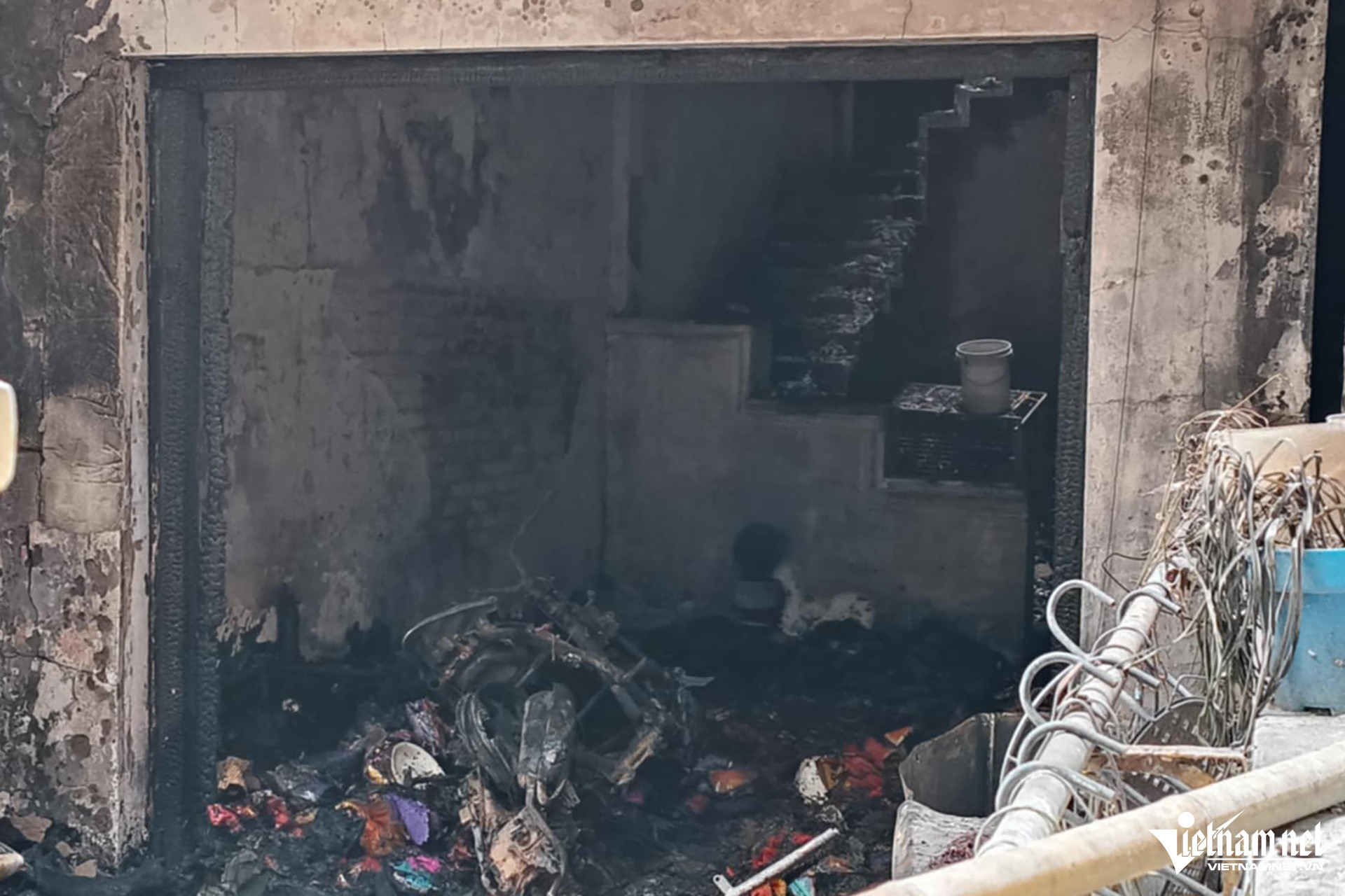 Ngôi nhà xảy ra cháy cao hai tầng và một tum, phía trước có khoảng sân rộng, phần ban công không rào chắn. Tầng một là nơi làm vàng mã. Các tài sản, vật dụng ở tầng này bị lửa thiêu rụi, sức nóng làm nhiều mảng tường ám khói, bong vữa xi măng, một chiếc xe máy để ở sân nhà bị thiêu rụi.