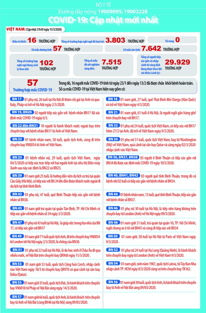 16/03/2020 15:44Diễn biến dịch Covid-19 tại Việt Nam ngày 16/3: 57 ca dương tính, gần 30.000 người phải theo dõi y tế