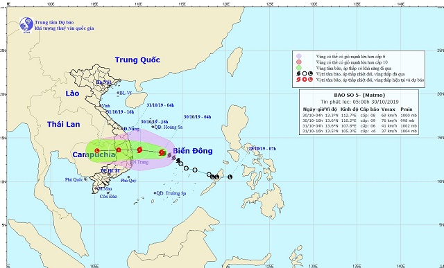 Dự báo trong 12 giờ tới, bão di chuyển theo hướng Tây Tây Bắc, mỗi giờ đi được 15 - 20km và có khả năng mạnh thêm. Đến 16h ngày 30/10, vị trí tâm bão ở trên vùng biển các tỉnh Quảng Ngãi - Ninh Thuận. Sức gió mạnh nhất vùng gần tâm bão mạnh cấp 9 (75 - 90km/giờ), giật cấp 11.