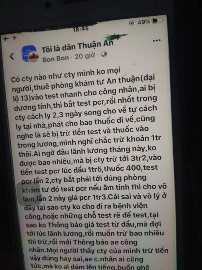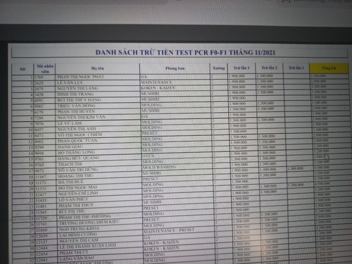 Theo danh sách thì có 57 lao động bị trừ tất cả là 152 triệu đồng. Trong khi đó, theo Sở Y tế Bình Dương, từ tháng 11.2021 trở về trước, giá xét nghiệm RT-PCR từ 1,7 triệu đồng/1 mẫu. Hiện nay, giá xét nghiệm RT-PCR của các cơ sở y tế từ 450.000 đồng đến 1,3 triệu đồng/mẫu. Doanh nghiệp và công nhân lao động có thể lựa chọn các cơ sở y tế đủ điều kiện trên địa bàn để xét nghiệm.