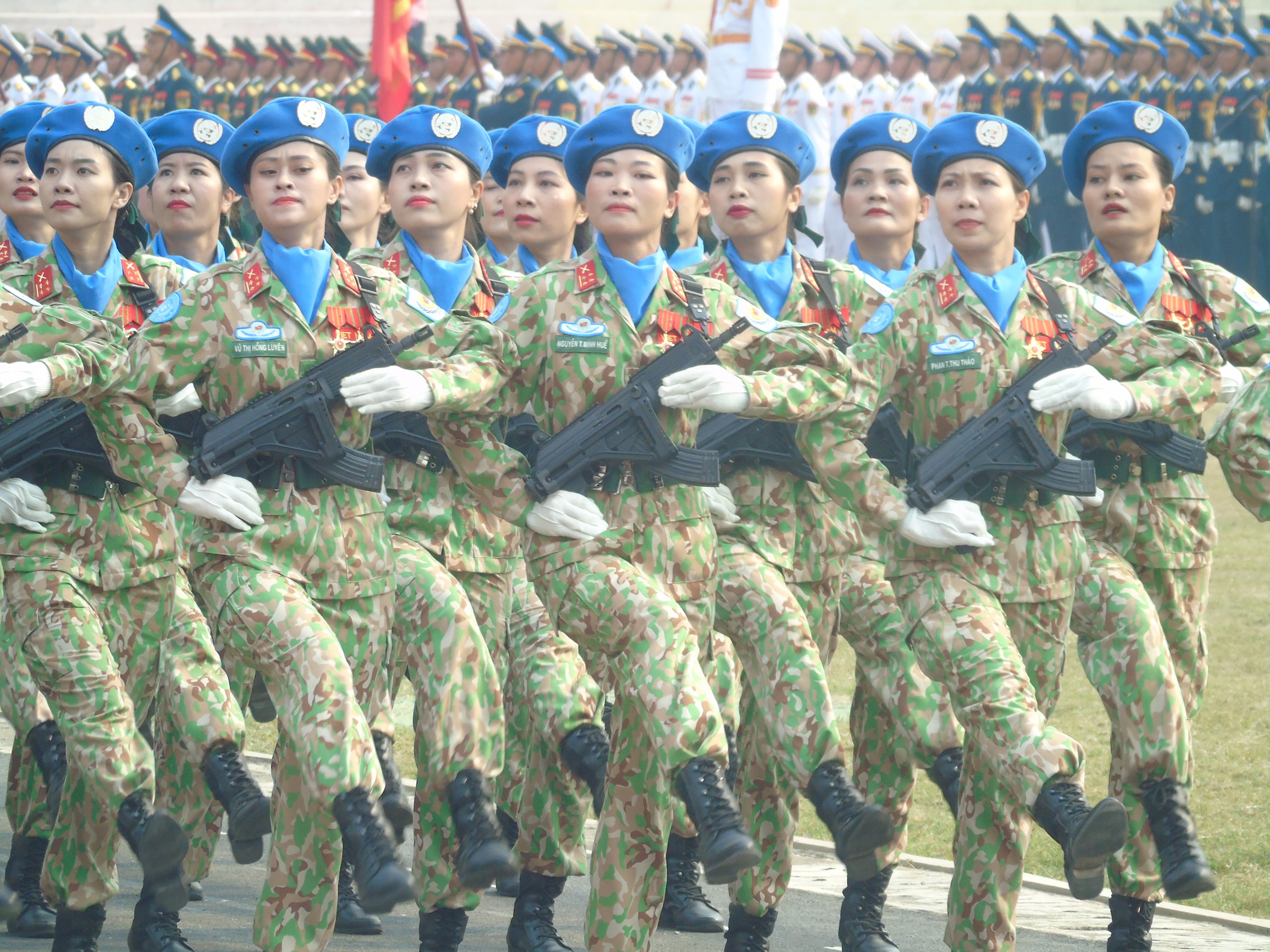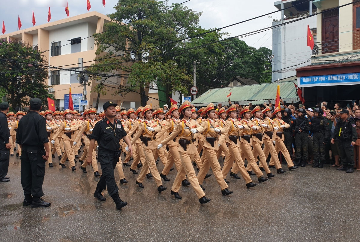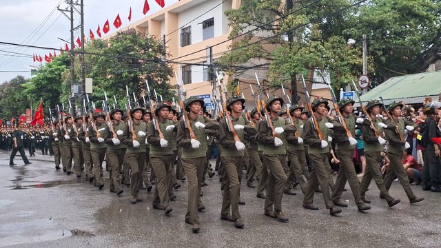 Trong đó, phần diễu binh của Quân đội, Dân quân tự vệ có sự tham gia của đầy đủ các lực lượng: Khối nữ Quân nhạc; khối chiến sĩ Điện Biên; các khối sĩ quan: Lục quân, Hải quân, Phòng không - Không quân, Biên phòng, Cảnh sát biển, nữ sĩ quan Quân y; lực lượng Tác chiến không gian mạng, lực lượng Gìn giữ hòa bình Việt Nam (nữ); các khối chiến sĩ: Lục quân, Đặc công, Đặc nhiệm; khối nữ dân quân các dân tộc Tây Bắc; khối nữ du kích miền Nam; khối Hồng kỳ.