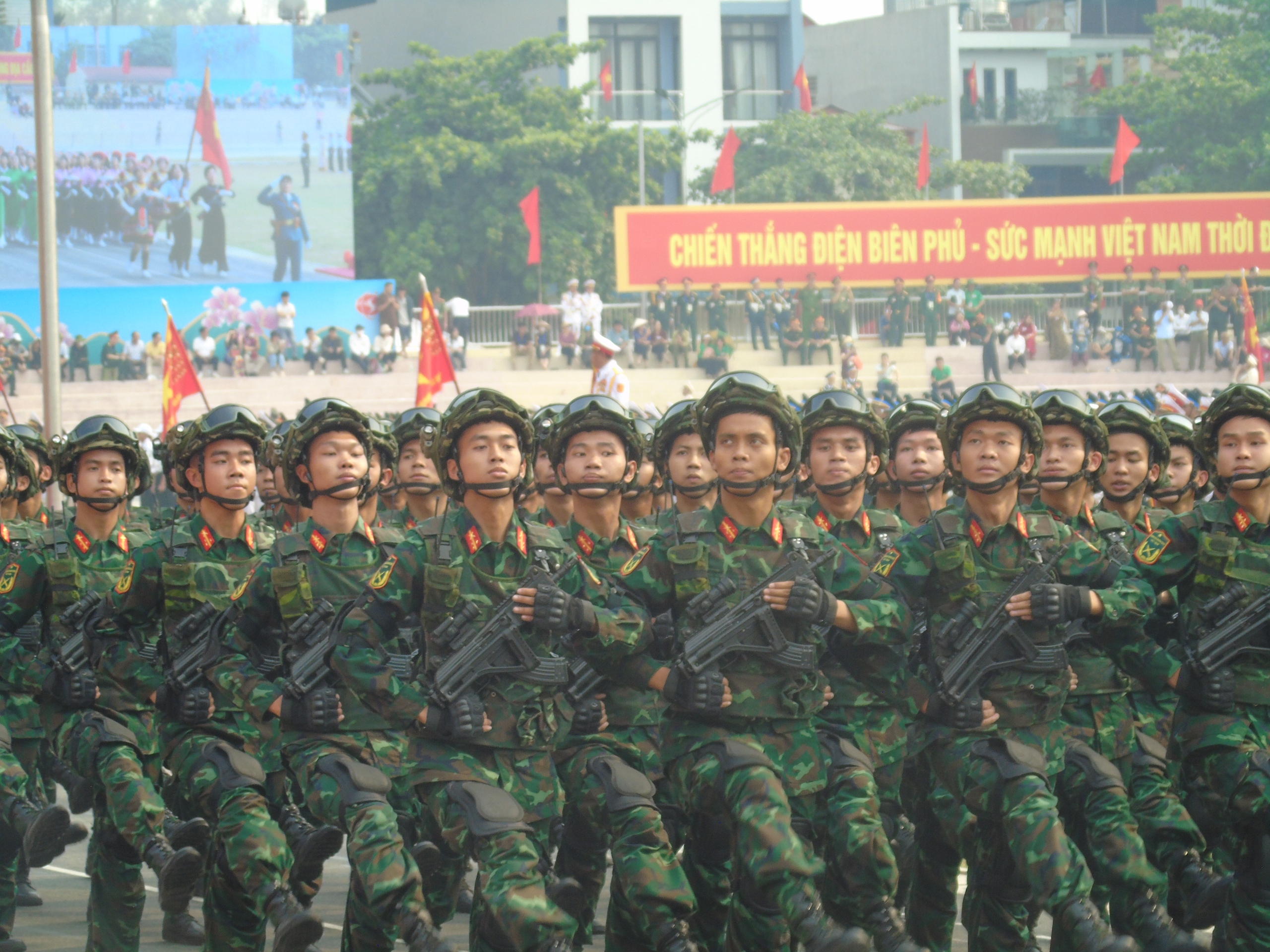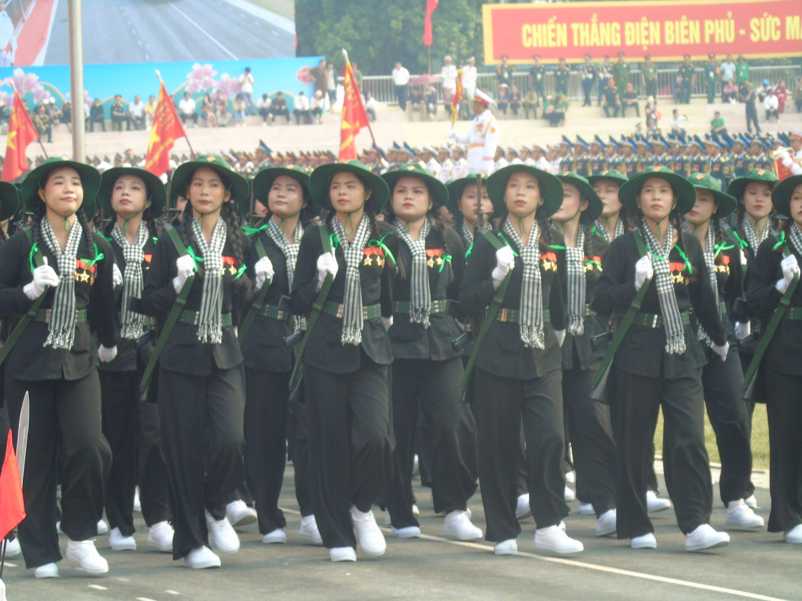 Cuộc diễu binh lịch sử kỷ niệm 70 năm chiến thắng Điện Biên PhủSáng 7/5, đại lễ kỷ niệm 70 năm chiến thắng Điện Biên Phủ sẽ diễn ra với phần diễu binh, diễu hành được đầu tư hoành tráng. Mở đầu phần diễu hành là tiếng rền vang của 21 phát đại bác 105mm trên nền quốc thiều. Sau đó, đoàn trực thăng Quân chủng Phòng không - Không quân mang theo cờ Tổ quốc và cờ Đảng sẽ bay biểu diễn qua lễ đài. Tiếp theo, các khối mô hình; xe chỉ huy; khối các quân binh chủng của quân đội, công an; khối công nhân, nông dân, thanh niên, trí thức... lần lượt diễu hành. Điểm đặc biệt trong phần diễu hành là sự xuất hiện của khối Chiến sĩ Điện Biên, Dân công hỏa tuyến (xe đạp thồ) và Nữ du kích các dân tộc Tây Bắc với trang phục, vũ khí được phục dựng chi tiết theo lịch sử 70 năm trước.