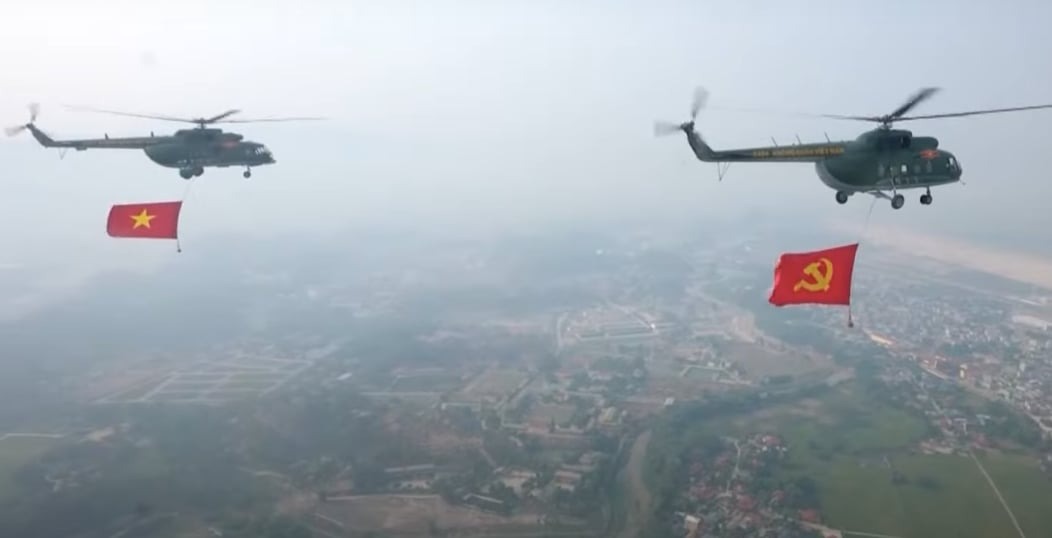 Mở màn, 9 máy bay trực thăng mang cờ Đảng, cờ Tổ quốc bay qua Lễ đài. Tiếp đó, lần lượt là phần trình diễn của các khối diễu binh.