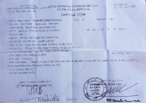Ông Trương sau đó được đưa vào khoa Nhi lây cấp cứu vì huyết áp cao. "0h ngày 11/10, ông ra mồ hôi, sau khi tiêm một mũi thuốc bác sĩ chuyển ông lên Bệnh viện Đa khoa Hà Tĩnh chưa trị, song gần vào đến nơi thì tắt thở", người con dâu Phan Thị Dung nói.