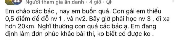 Một người mẹ khác than thở về kết quả con vừa đạt được trong kỳ thi vừa qua: "Em chào các bác. Nay em buồn quá, con gái em thiếu 0,5 điểm để đỗ nguyện vọng 1, nguyện vọng 2. Bây giờ phải đi học nguyện vọng 2, đi xa nhà hơn 20km. Nghĩ thương con quá các bác ạ. Em đang định làm đơn phúc khảo bài thi, không biết có được không".