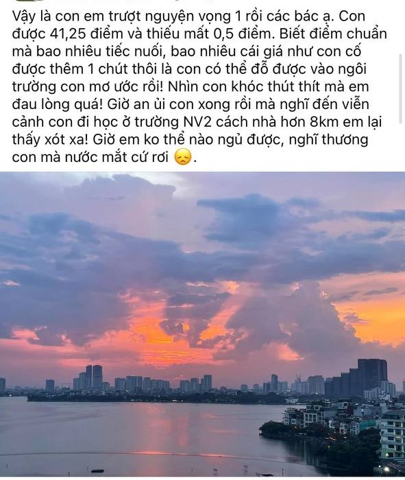 "Vậy là con em trượt nguyện vọng 1 rồi các bác ạ. Con được 41,25 điểm và thiếu mất 0,5 điểm. Biết điểm chuẩn mà bao nhiêu tiếc nuối, bao nhiêu cái 'giá như' con cố thêm được một chút thôi là con có thể đỗ được vào ngôi trường con mơ ước rồi. Nhìn con khóc thút thít mà em đau lòng quá! Giờ an ủi con xong rồi mà nghĩ đến viễn cảnh con đi học ở trường nguyện vọng 2, cách nhà hơn 8km em lại thấy xót xa. Giờ em không thể nào ngủ được, nghĩ thương con mà nước mắt cứ rơi", một phụ huynh chia sẻ.