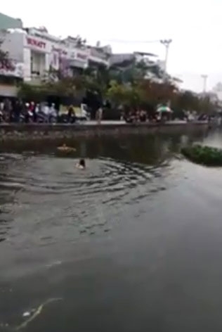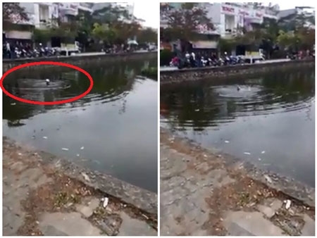 | Khi không nhìn thấy nam thanh niên trên hồ, mọi người mới hốt hoảng hò nhau nhảy xuống tìm kiếm. (Ảnh cắt từ clip) |