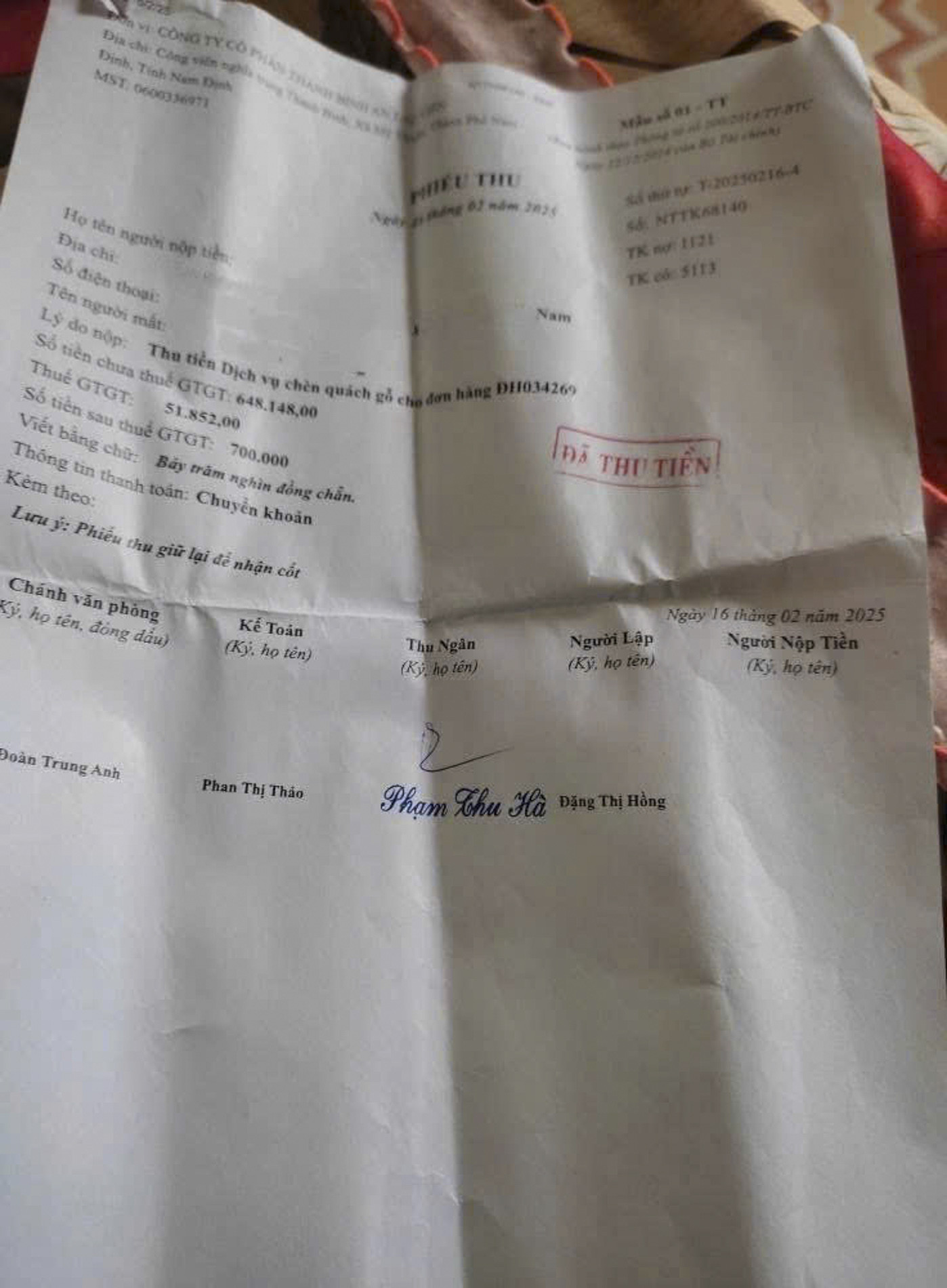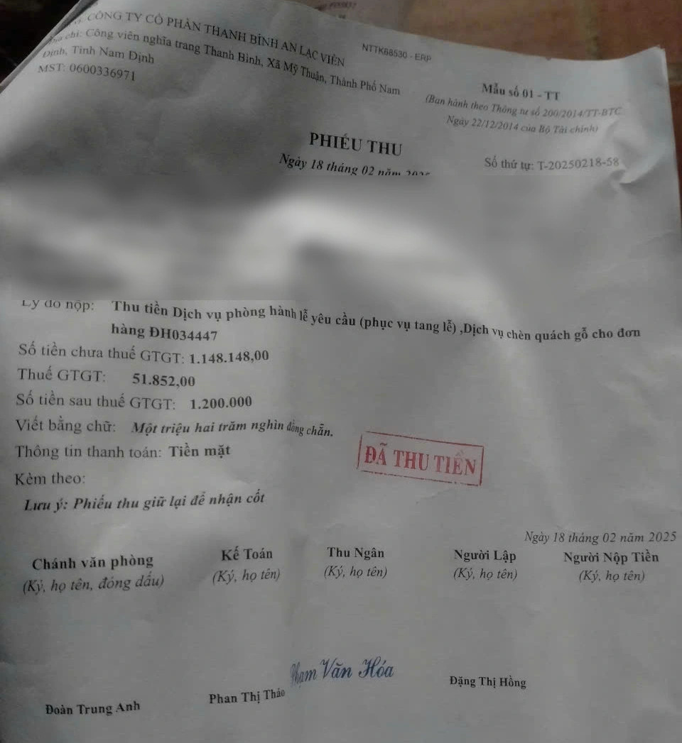 "Khi đó đưa bố tôi vào lò hoả táng, không thể đưa ra được nữa, nên gia đình phải chấp nhận. Để đưa cốt bố tôi ở trong tiểu sành mua của họ vào trong tiểu gỗ gia đình mang đến, công ty yêu cầu chúng tôi đóng thêm 1,2 triệu, trong đó có dịch vụ phòng tang lễ yêu cầu và chèn quách gỗ.