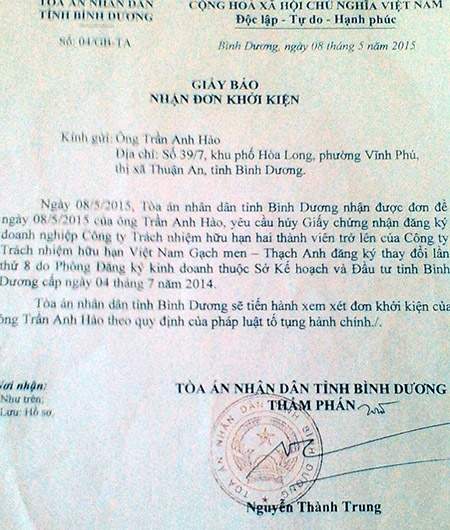 Vụ kiện hành chính nói trên đã được TAND tỉnh Bình Dương thụ lý. Nguyên đơn là ông Trần Anh Hào – nguyên Tổng giám đốc công ty TNHH Việt Nam Thạch Anh (gọi tắt là công ty ViCeRa, trụ sở TX Bến Cát, tỉnh Bình Dương) đồng thời là đại diện một số cổ đông công ty trên; còn bị đơn là phòng Kinh doanh của sở KH&ĐT tỉnh Bình Dương.