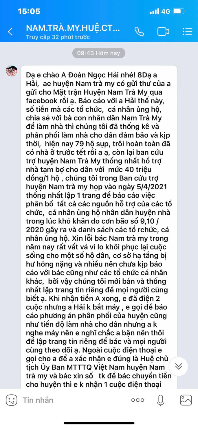 Lúc đó, bà Huệ có hỏi ông Hải ủng hộ nhân dân huyện bao nhiêu thì ông Đoàn Ngọc Hải nói chưa biết vì ngày mai có đoàn nào đó tổ chức buổi biểu diễn thiện nguyện, kêu gọi được bao nhiêu tiền thì sẽ chuyển bấy nhiêu. 2-3 ngày sau, ông Hải chuyển vào tài khoản của Ban cứu trợ huyện Nam Trà My hơn 106 triệu đồng. Khi đó, bà Huệ gọi điện 2 cuộc để báo đã nhận được tiền, gửi lời cảm ơn và thông tin sơ lược về phương án phân phối của huyện cho các hộ dân nhưng ông Đoàn Ngọc Hải không nghe máy. Bà Huệ nghĩ ông Đoàn Ngọc Hải bận việc nên không gọi, nhắn tin nữa mà dự định sẽ lập trang mạng công khai số tiền của ông Hải và các cá nhân, tổ chức hỗ trợ huyện.