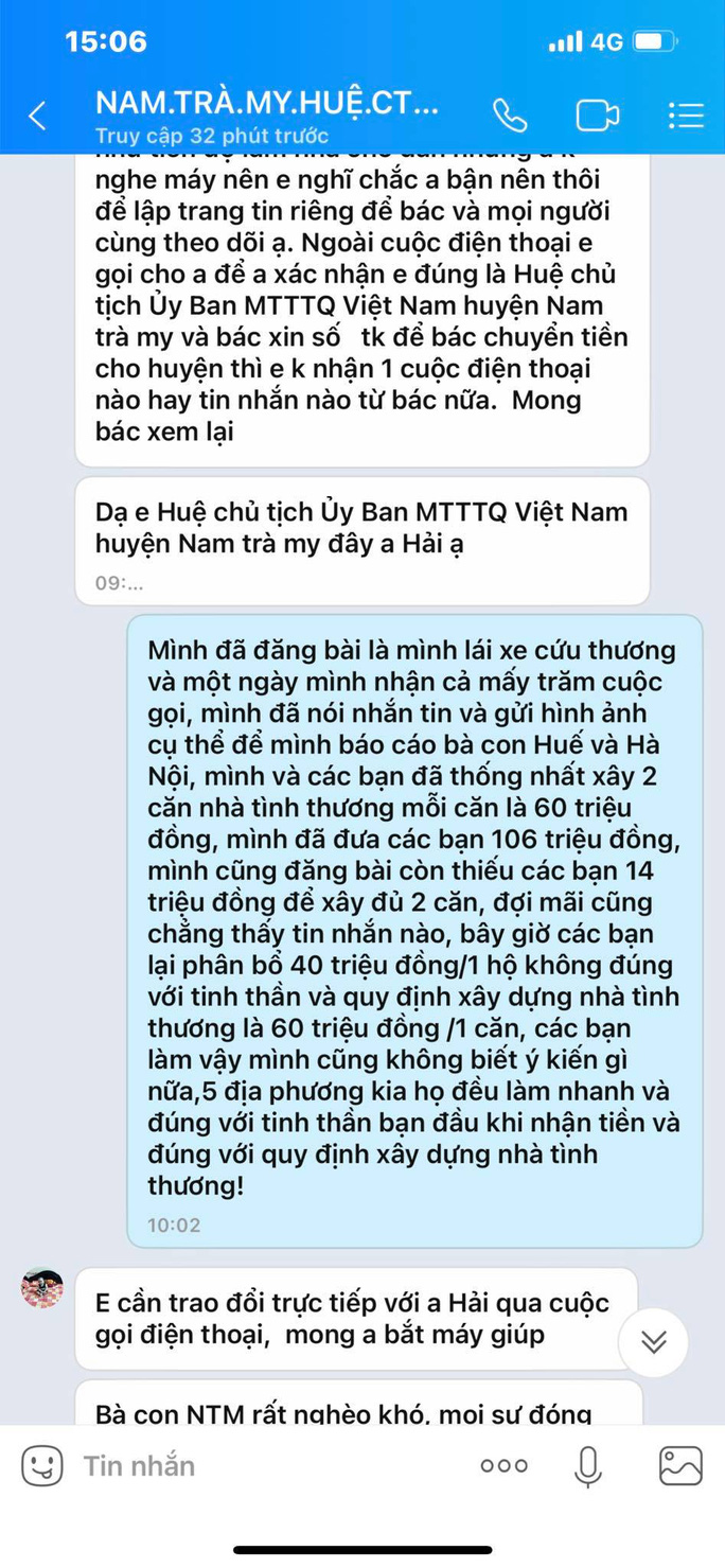 "Sáng nay qua tin nhắn với chị, tôi cũng không ngờ lại phân bổ 40 triệu đồng/1 hộ không đúng với tinh thần ban đầu và không đúng với những quy định về xây nhà tình thương là 60 triệu đồng/1 căn. Thậm chí, nhà tình thương nếu cần phải tăng lên 70-80 triệu đồng mới đúng với tình hình tăng giá vật liệu xây dựng của thị trường.