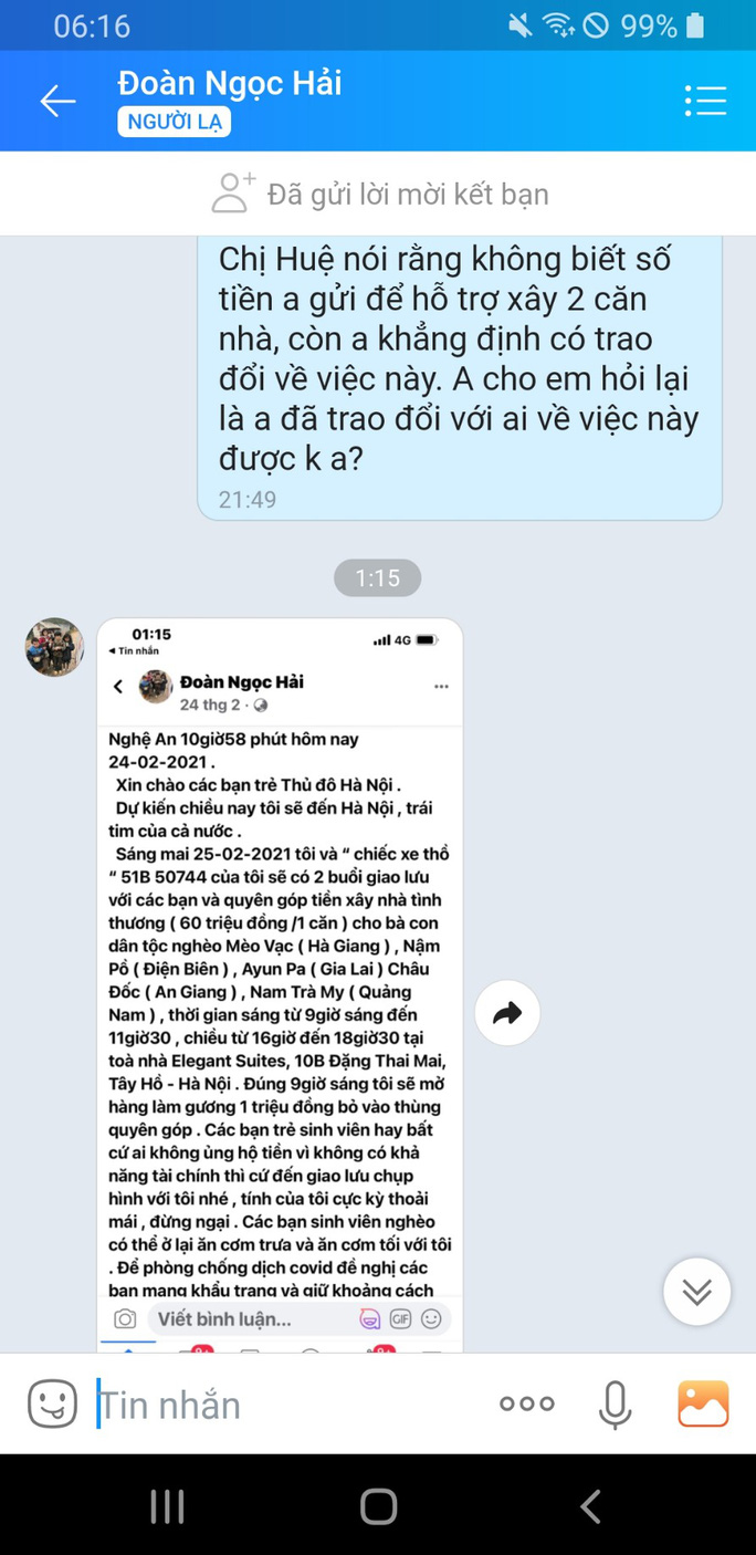 Bà Huệ nói rằng vì không theo dõi Facebook của ông Hải nên không biết rằng ông yêu cầu làm 2 căn nhà với kinh phí 60 triệu đồng/căn, cũng không biết là ông Hải sẽ chuyển thêm 14 triệu đồng như tin nhắn ông trao đổi hôm nay.