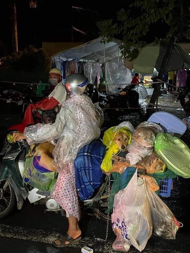 Chiếc xe máy chất lỉnh kỉnh quạt máy, chăn chiếu, phía sau người vợ ngồi vắt vẻo, thỉnh thoảng chị dang 2 tay xốc lại 2 chú chó lớn ngồi sau. Đặc biệt, người phụ nữ này còn ôm theo một con chó nhỏ trong lòng. Phía trước người chồng cũng ôm thêm 2 con, ngồi trên đùi chủ, bám đầu xe đón gió. Tưởng chừng chỉ có 5 chú chó, nhưng hóa ra gia đình còn "đèo bòng" theo hàng chục chú chó con khác theo về quê tránh dịch.