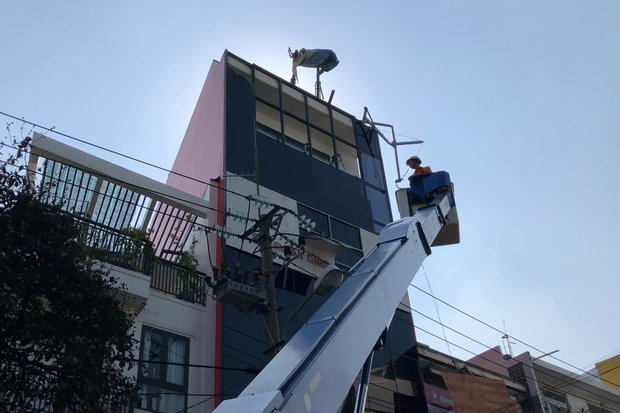 Đặc biệt, giàn treo đập vào lan can tầng 2 nhà 181 Triệu Nữ Vương bên cạnh, suýt đập trúng chủ nhà đang đứng gần lan can. Rất may, nhóm công nhân bên trong giàn treo không bị thương, nhưng phải trèo nhờ vào tầng 2 nhà 181 để xuống dưới.