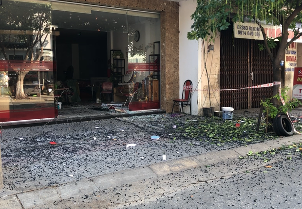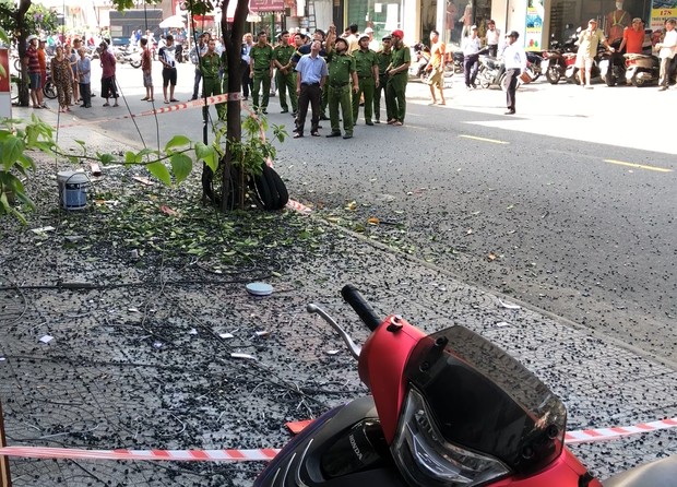 Sự cố còn làm rơi tấm vách kính lớn xuống đất vỡ vụn và 1 thanh sắt dài khoảng 4m vướng vào đường dây điện hạ thế, gây tiếng nổ lớn.