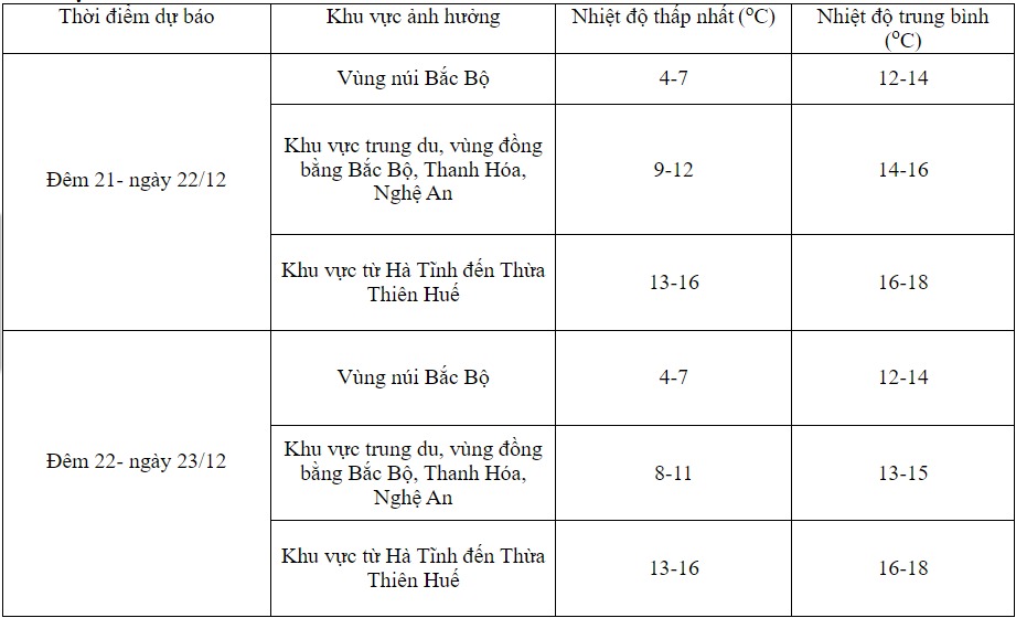 Ở Bắc Bộ, Thanh Hóa và Nghệ An trời tiếp tục rét đậm, vùng núi rét hại; ở khu vực từ Hà Tĩnh đến Thừa Thiên-Huế trời rét. Nhiệt độ thấp nhất về đêm và sáng sớm ở Bắc Bộ, Thanh Hóa và Nghệ An phổ biến từ 8-11 độ, riêng khu vực vùng núi Bắc Bộ phổ biến 4-7 độ, vùng núi cao có nơi dưới 3 độ; ở khu vực từ Hà Tĩnh đến Thừa Thiên-Huế phổ biến từ 13-16 độ.