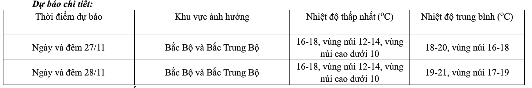 Ở Bắc Bộ và Bắc Trung Bộ trời rét. Nhiệt độ thấp nhất trong đợt không khí lạnh này ở Bắc Bộ và Bắc Trung Bộ phổ biến từ 16-18 độ, vùng núi 12-14 độ, vùng núi cao dưới 10 độ.