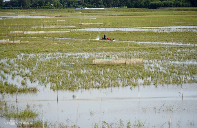 Mấy tuần trước, có vài cơn mưa lớn, nước ngập xăm xắp ruộng. Nghĩ lũ bắt đầu về, anh Phương đắp bờ, dùng máy xới đất tơi xốp để làm vụ đông xuân. Tuy nhiên, những ngày sau đó nắng gắt, mặt ruộng tiếp tục cạn nước, khô nứt nẻ.