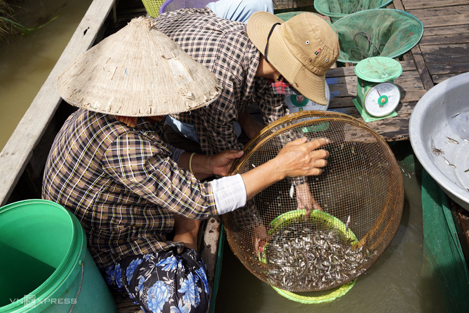 Anh Bi có 7 miệng dớn, trước đây bèo nhất một ngày cũng được vài chục ký cá. Còn hiện nay, nước lũ không về, chưa ngày nào vợ chồng anh bắt quá 10 kg. Do nguồn cá linh ít nên giá mua sỉ tại ruộng khá cao, khoảng 70.000 đồng mỗi ký, các thương lái tiếp tục bán lẻ lại với giá 150.000-300.000 đồng mỗi ký. Giá cá lóc, trê 80.000 đồng mỗi ký; cua đồng 50.000 đồng một ký, đắt hơn so với mùa lũ năm ngoái 10.000-15.000 đồng.