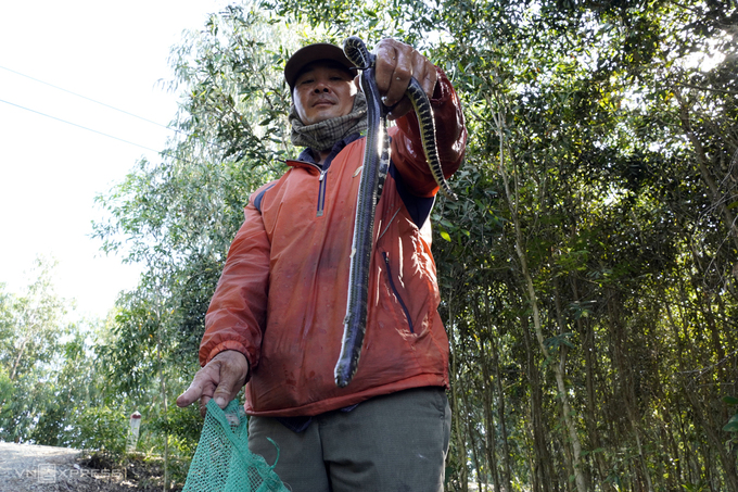 "Hơn 600 cái lợp, mà giờ chỉ mới xuống có mấy chục cái vì nước nhỏ, không có cua, mấy bữa nay tôi phải đặt thêm mấy cái dớn để kiếm cá ăn", ông Thạnh nói. Cạnh căn chòi ông Thạnh, ông hàng xóm vừa thăm dớn trở về, trong túi lưới chỉ có vài con rắn bông súng nhỏ.