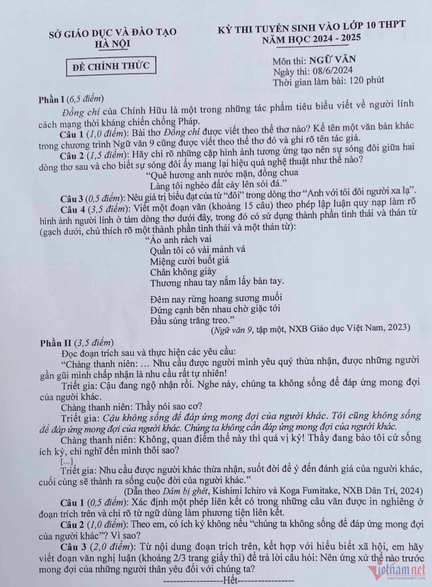 Dưới đây là đề thi lớp 10 môn Ngữ văn tại Hà Nội năm 2024: