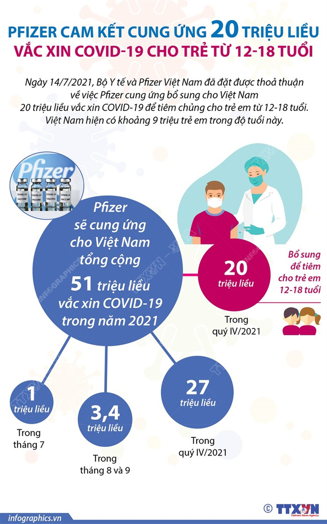 Ngày 14/7/2021, Bộ Y tế và Pfizer Việt Nam đã đặt được thoả thuận về việc Pfizer cung ứng bổ sung cho Việt Nam 20 triệu liều vắc xin COVID-19 để tiêm chủng cho trẻ em từ 12-18 tuổi. Việt Nam hiện có khoảng 9 triệu trẻ em trong độ tuổi này.