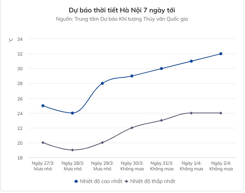 Ngày 27-30/3, thời tiết thủ đô ghi nhận mức nhiệt thấp nhất 18-20 độ C về đêm và sáng sớm kèm mưa vài nơi. Ban ngày, nhiệt độ tăng dần và có thể đạt mức cao nhất 25-27 độ C.