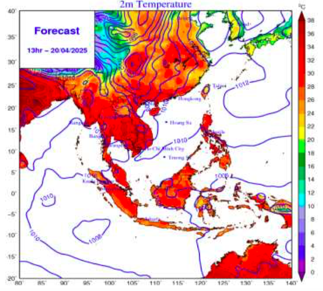Ngày 20 đến 21-4, khu vực từ Thanh Hóa đến Phú Yên có nắng nóng, có nơi nắng nóng gay gắt với nhiệt độ cao nhất phổ biến 35-38 độ C, có nơi trên 38 độ C; độ ẩm tương đối thấp nhất phổ biến 45-50%.