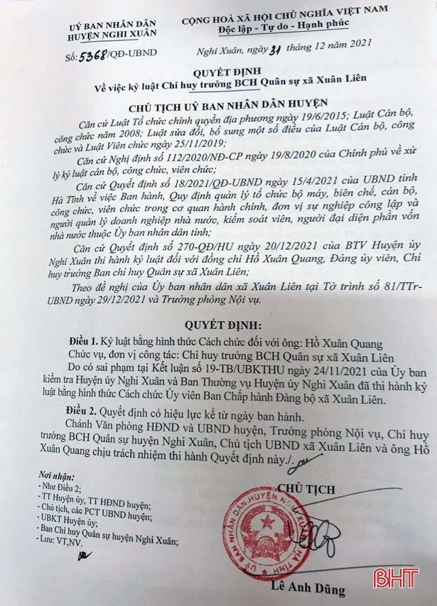 Trưa nay (8/1), Chủ tịch UBND huyện Nghi Xuân Lê Anh Dũng cho biết, vừa ký quyết định kỷ luật cách chức Chỉ huy trưởng Ban Chỉ huy Quân sự xã Xuân Liên đối với ông Hồ Xuân Quang do có sai phạm tại kết luận số 19-TB/UBKTHU của Ủy ban Kiểm tra Huyện ủy Nghi Xuân và Ban Thường vụ Huyện ủy Nghi Xuân.