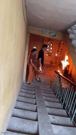 Theo dõi đoạn clip cho thấy, sau khi phát hiện thấy khói bay vào nhà khó chịu, một người phụ nữ ra ngoài kiểm tra thì phát hiện hai người hàng xóm đang đứng đốt vàng mã ngay góc cầu thang của khu tập thể. Do ngựa và vàng mã dễ cháy nên ngọn lửa bùng lên, đỏ rực một góc cầu thang.