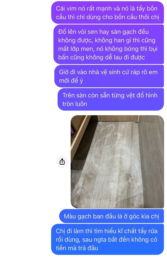 - Nhà mình cũng thuê giúp việc theo giờ như thế xong chị ấy đổ Vim vào vỡ hết cả keo ở sàn WC. Mình hỏi thì chị khóc lóc bảo không biết. Sau đó mình phải thay nguyên 3 miếng gạch vì bị đổ Vim. Cáu mà không làm gì được, bắt đền thì người ta không có tiền.