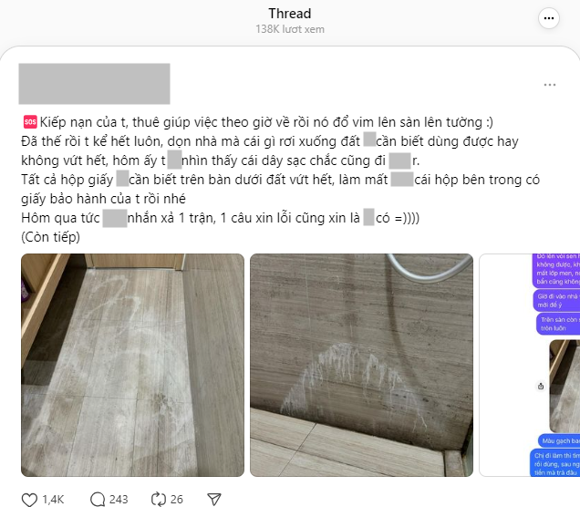 Câu chuyện bắt đầu từ một bài đăng của người dùng MXH có tên viết tắt là P. về người giúp việc theo giờ của mình. Người này cho biết giúp việc đã đổ Vim (nước tẩy bồn cầu” lên sàn và tường nhà vệ sinh; tất cả mọi thứ rơi xuống đất là sẽ vứt hết, không cần biết còn dùng được hay không; làm mất giấy tờ của chủ nhà; nhắn tin trao đổi thì seen, không hề nhận sai hay xin lỗi;...