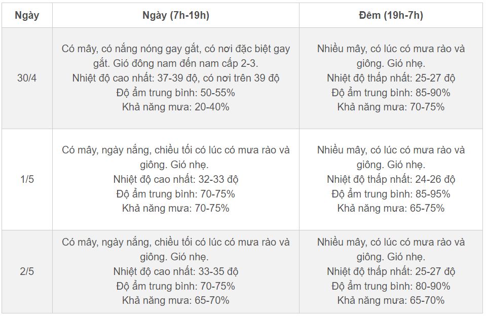 Khu vực từ Hà Tĩnh đến Phú Yên duy trì tình trạng nắng nóng đặc biệt gay gắt với nhiệt độ cao nhất khoảng 39-42 độ trong ngày 30/4 và 1/5; từ 2/5, mức độ nắng nóng giảm xuống với nhiệt độ cao nhất 35-37 độ.