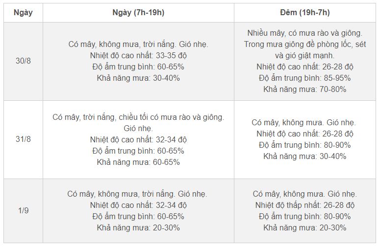Riêng thời tiết Hà Nội, từ 30-31/8, có mây, ban ngày không mưa, trời nắng, chiều tối và đêm có mưa rào và giông. Từ 1-5/9, không mưa, ngày nắng. Từ khoảng 6-8/9, khả năng có mưa rào và giông rải rác, cục bộ có mưa to. Nhiệt độ cao nhất từ 31-34 độ; nhiệt độ thấp nhất ban đêm 26-28 độ.