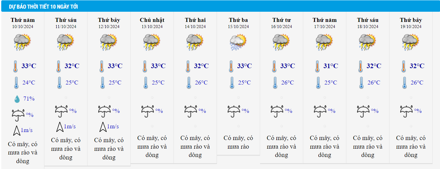 Có mây, có mưa rào và giông vài nơi; riêng chiều và đêm có mưa rào và giông rải rác, cục bộ có nơi mưa to. Gió nhẹ. Trong mưa giông có khả năng xảy ra lốc, sét và gió giật mạnh.