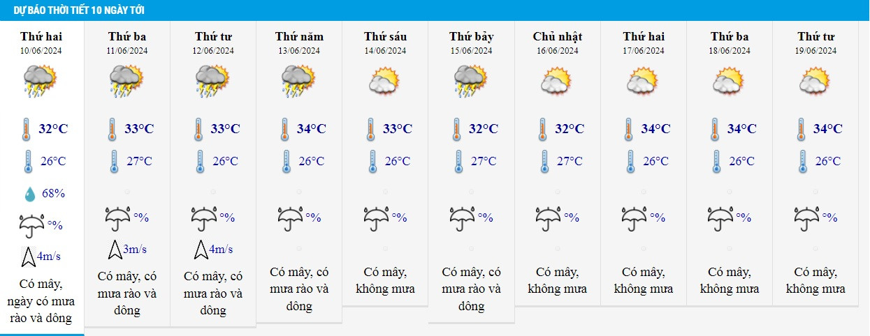 Có mây, chiều tối và đêm có mưa rào và giông vài nơi, ngày nắng, có nơi nắng nóng. Phía Bắc gió nhẹ, phía Nam gió tây nam cấp 2-3. Trong mưa giông có khả năng xảy ra lốc, sét, mưa đá và gió giật mạnh.