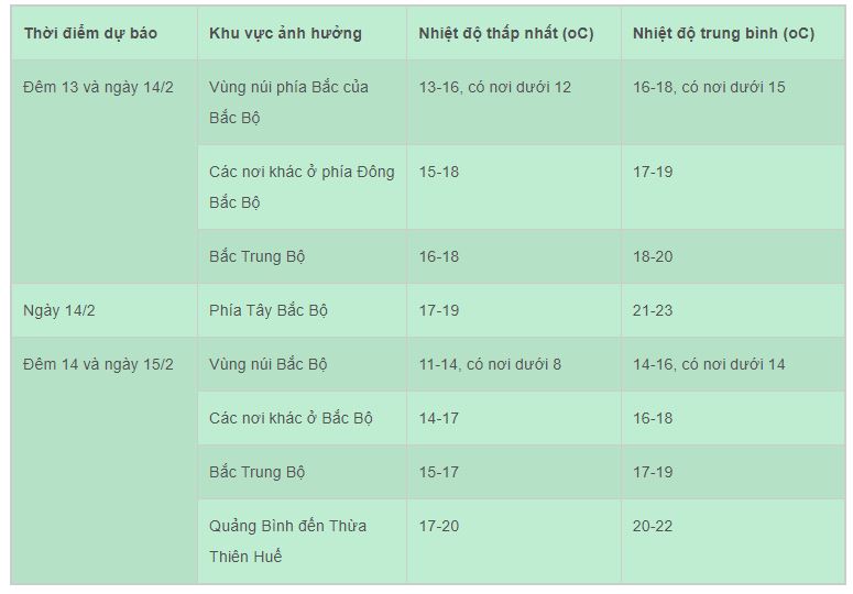 Trong đợt không khí lạnh này, nhiệt độ thấp nhất ở Bắc Bộ và Bắc Trung Bộ phổ biến 14-17 độ, vùng núi Bắc Bộ 10-13 độ, vùng núi cao có nơi dưới 8 độ; khu vực từ Quảng Bình đến Thừa Thiên Huế 16-19 độ.