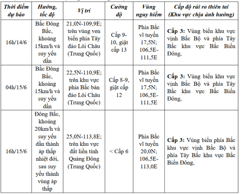 Phía Tây Bắc khu vực Bắc Biển Đông có gió mạnh cấp 6, giật cấp 8, sóng biển cao 2-4m, biển động. Tàu thuyền hoạt động trong các vùng nguy hiểm nói trên đều có khả năng chịu tác động của giông, lốc, gió mạnh, sóng lớn.