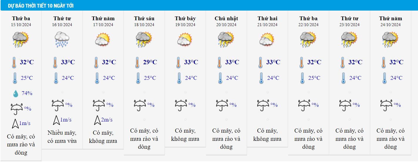 Nhiều mây, có mưa rào và giông rải rác, cục bộ có nơi mưa to. Gió nhẹ. Trong mưa giông có khả năng xảy ra lốc, sét và gió giật mạnh.