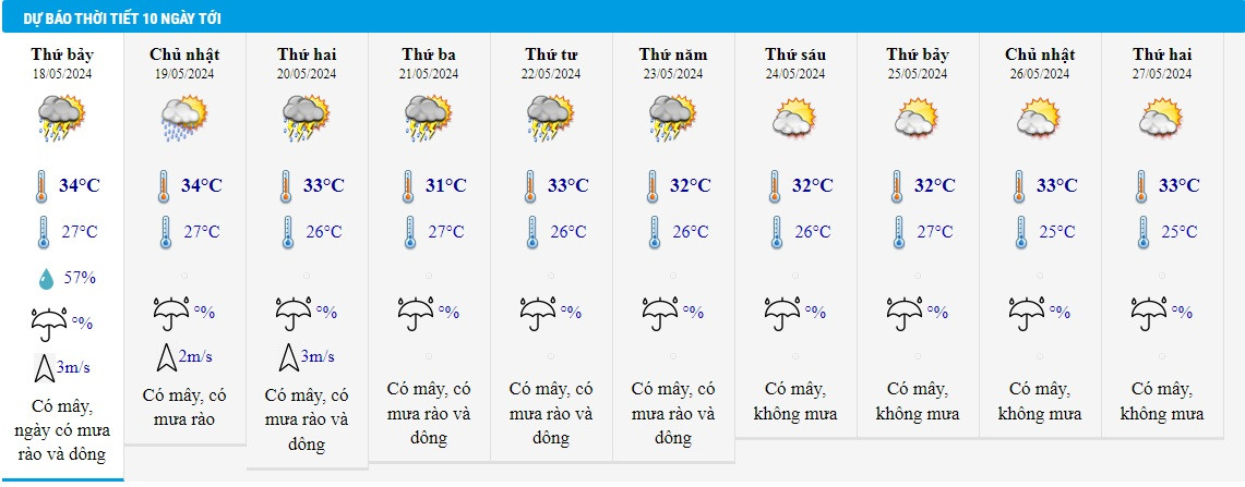 Có mây, ngày nắng, có nơi nắng nóng; chiều và tối có mưa rào và giông rải rác, cục bộ có mưa to. Gió đông nam cấp 2-3. Trong mưa giông có khả năng xảy ra lốc, sét, mưa đá và gió giật mạnh.