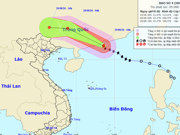 Về bão số 4, dự báo trong những giờ tới, bão di chuyển theo hướng Tây Tây Bắc, mỗi giờ đi được khoảng 20km, đi vào đất liền phía Nam tỉnh Quảng Đông (Trung Quốc).