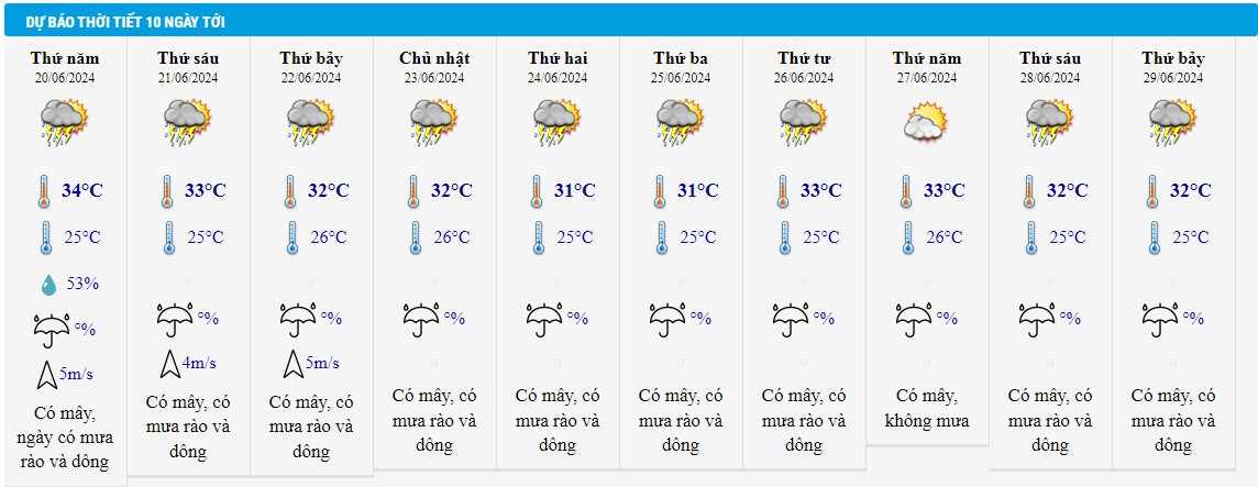 Có mây, đêm có mưa rào và giông, cục bộ có mưa to; ngày nắng nóng gay gắt, có nơi đặc biệt gay gắt. Gió đông nam đến nam cấp 2-3. Trong mưa giông có khả năng xảy ra lốc, sét, mưa đá và gió giật mạnh.