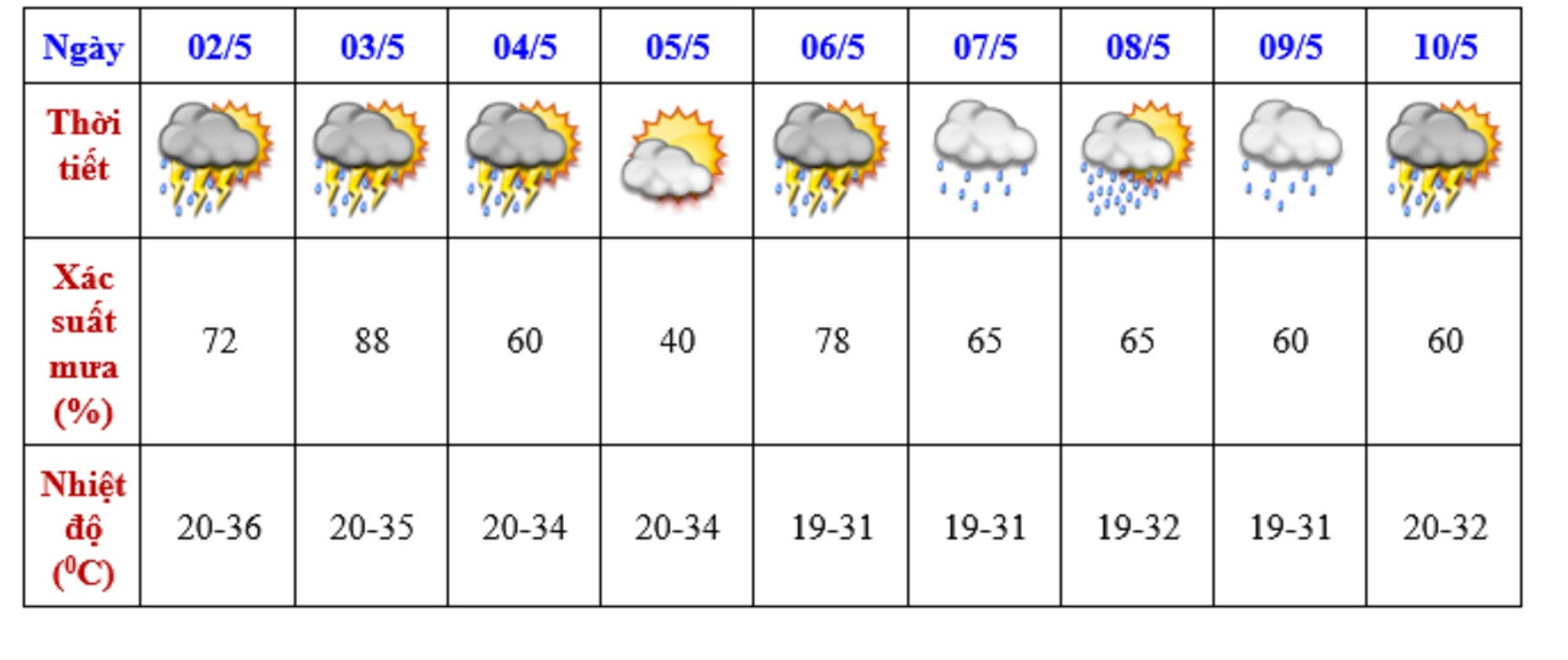 Có mây, ngày nắng nóng và nắng nóng gay gắt, có nơi đặc biệt gay gắt; chiều tối và đêm có mưa rào và giông vài nơi. Gió nhẹ. Trong mưa giông có khả năng xảy ra lốc, sét, mưa đá và gió giật mạnh.