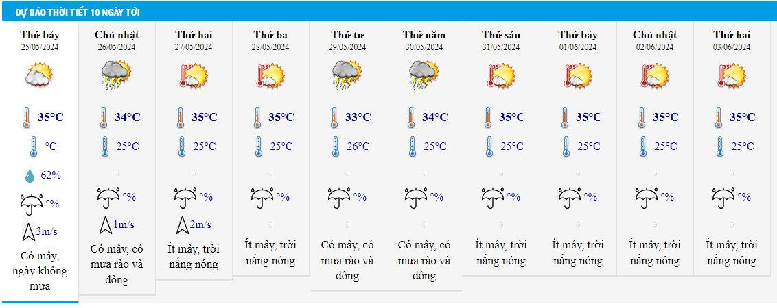 Có mây, đêm có mưa rào và giông vài nơi, ngày nắng; riêng phía Bắc chiều tối có mưa rào rải rác và có nơi có giông. Gió nhẹ. Trong mưa giông có khả năng xảy ra lốc, sét, mưa đá và gió giật mạnh.